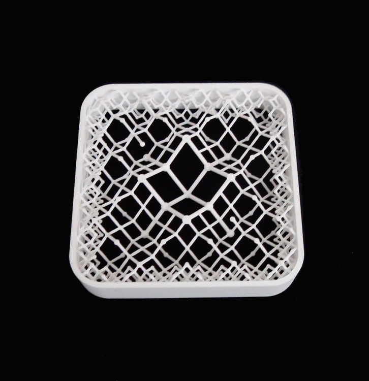 - A fractal structure where the 3D mesh is thinner near the outside of the product , and the size of which is increased as you move towards the inside